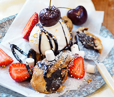 Sällan har det varit så populärt med friterade desserter som nu. Här använder vi oss av kladdkaka. Himmelskt gott och väldigt enkelt