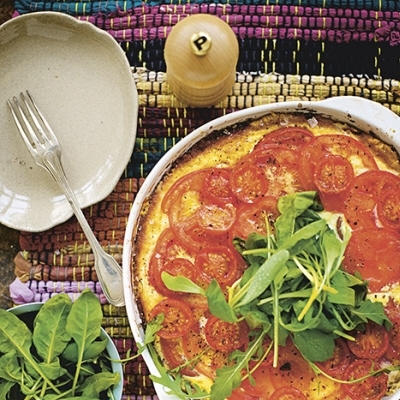 - Fördela tomaterna över hela pajen, peppra och grädda ytterligare 25 min.