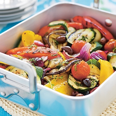 - Blanda grönsaker, lök, citronette och oliver i en serveringsform.